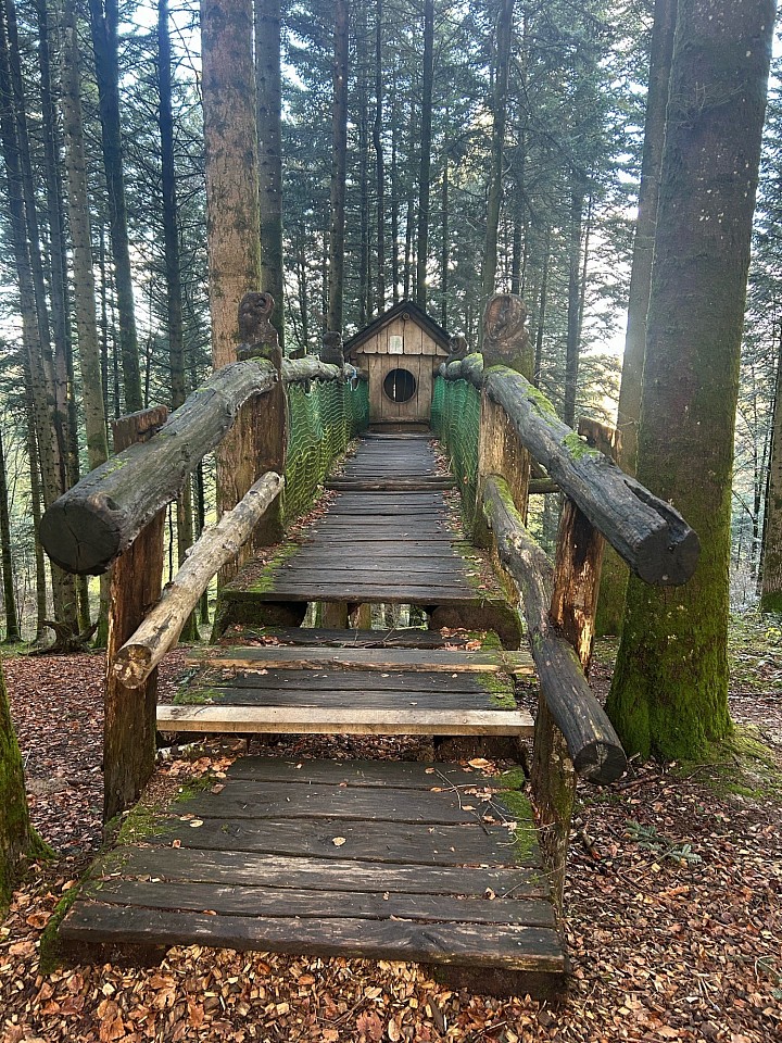 Vous découvrez les prochaines cabanes à travers les arbres, puis à gauche 👈 vous apercevez une belle passerelle en bois avec à son bout une petite maison, au niveau des barrières on y voit de belles créations dans du bois sculpté; bien sûr ça ne fait pas partie du sentier de l’avent, mais celui «À tire d’ailes», mais c’est tellement dommage de passer à côté.