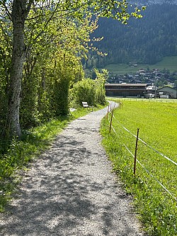 De ce côté, de nombreux bancs jalonnent le chemin, offrant des pauses reposantes avec un panorama splendide. La suite de la promenade vous mène à proximité du petit pont en bois où se rejoignent les deux itinéraires, puis le chemin remonte légèrement en direction du Ferien Lager Musikhaus et de la voie ferrée.