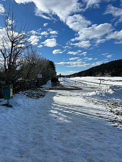 Le chemin se poursuit à droite, tout droit, vous observez que c’est très bien indiqué par de nombreux panneaux indicateurs qui sont présents tout au long du chemin, il suffit de suivre l’indication «Les Cluds». Vous traversez lors de cette balade des pâturages partiellement enneigés, qui dépendent bien sur des conditions météorologiques; ce qui explique le côté un peu éparses de l’enneigement sur le sol, cela peut être également un peu gelé et le niveau bas de dénivelés est très agréable à la marche. Au bout d’un kilomètre le chemin remonte légèrement, à proximité d’un espèce de refuge, où il y a une place de pique-nique.