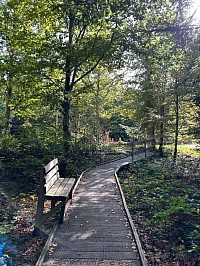 Il y a également plusieurs bancs tout au long du parcours. Ensuite la passerelle s’arrête et vous retrouvez un chemin goudronné. A l’arrivée de celui-ci, il faut traverser la route pour rejoindre la partie officielle du parcours Handicap.